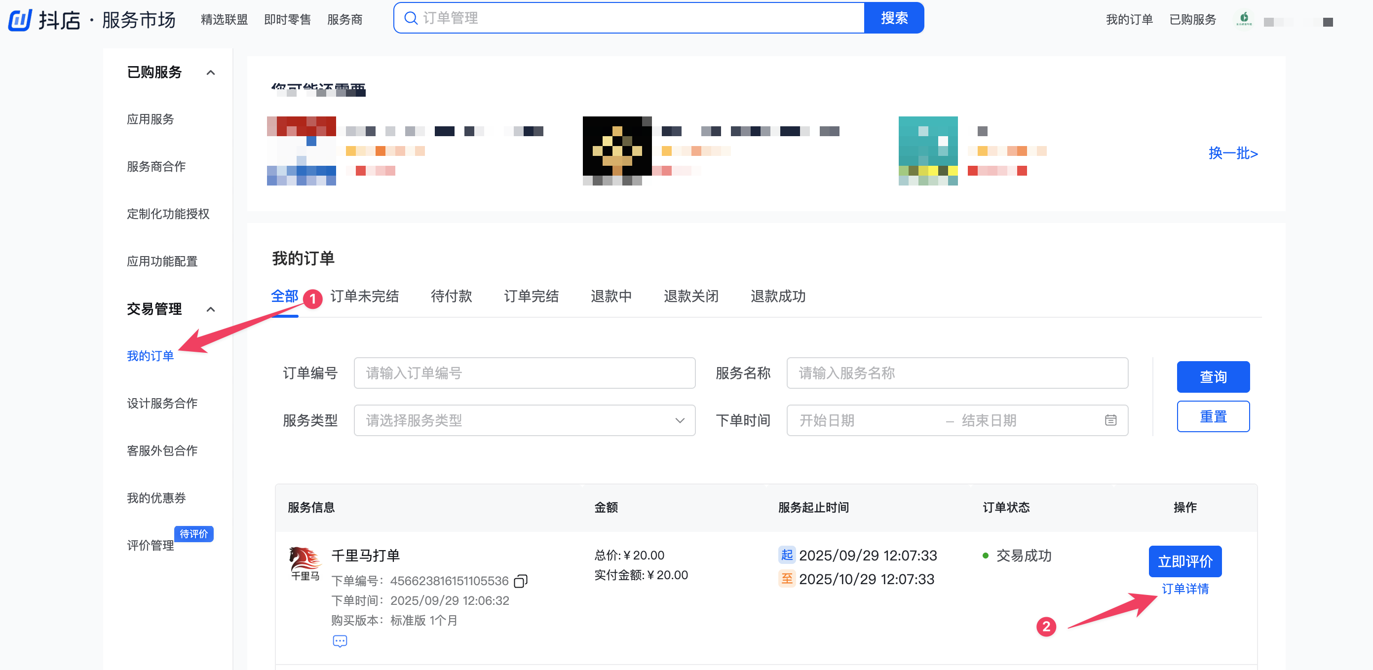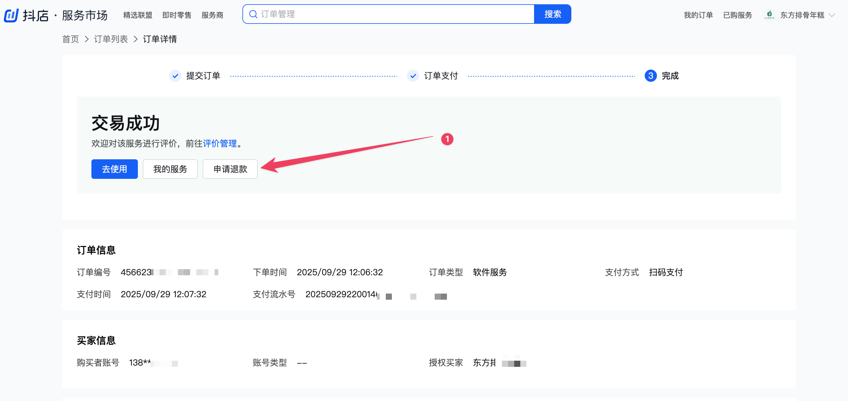 如有特殊情况,可通过下面操作进行申请退款,申请以后,平台会进行审核退款。 打开我的应用https://fuwu.jinritemai.com/orderList 在订单详细中文档更新时间: 2025-10-07 12:54 作者:admin