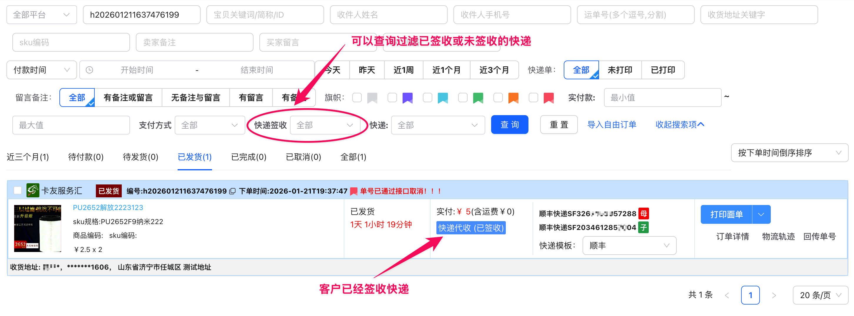 查询已经签收的订单,如果已经签收,会显示“已签收”字样。