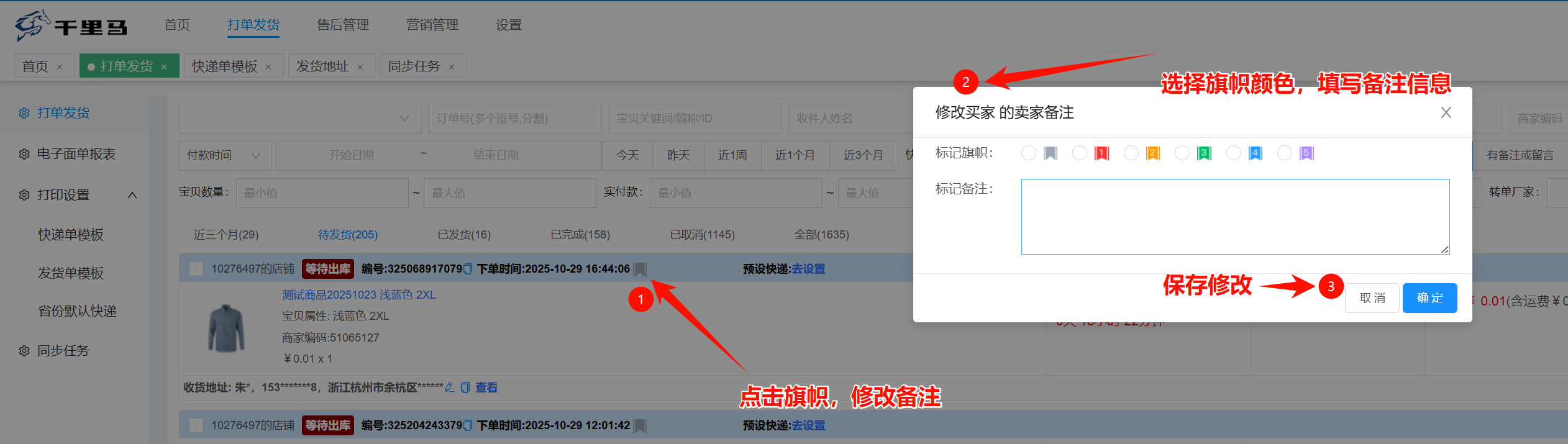 目录 搜索 订购应用与登录系统一、1分钟快速入门二、打单发货管理快递模板管理模板自定义区域设置订单插旗备注电子面单报表管理导入运单号发货创建自由订单订单同步取货/退货地址管理三、设置多店铺管理与授权厂家代发场景设置四、常见问题如果查看我订购的千里马安装电子面单打印组件快递模板自定义区域修改后不生效问题 暂无相关搜索结果! 订单插旗备注 在订单列表,可对订单进行插旗备注,操作如下图:文档更新时间: 2025-10-30 14:13 作者:hanson