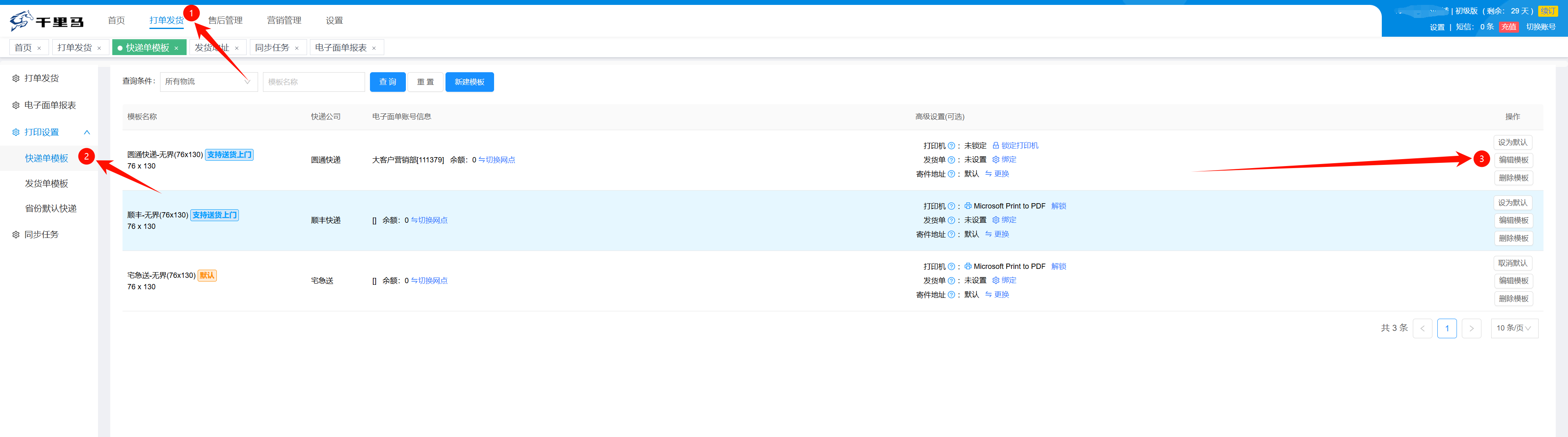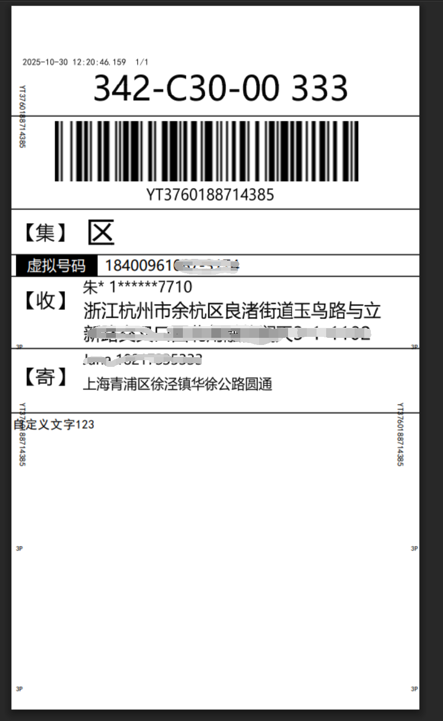 选择已创建的模板,点击“编辑”,进入模板编辑界面 编辑页面 面单打印效果如下: 注意:由于打印组件缓存,修改打印项后,需清除缓存并重启打印组件,使修改生效 文档更新时间: 2025-10-30 15:13 作者:hanson