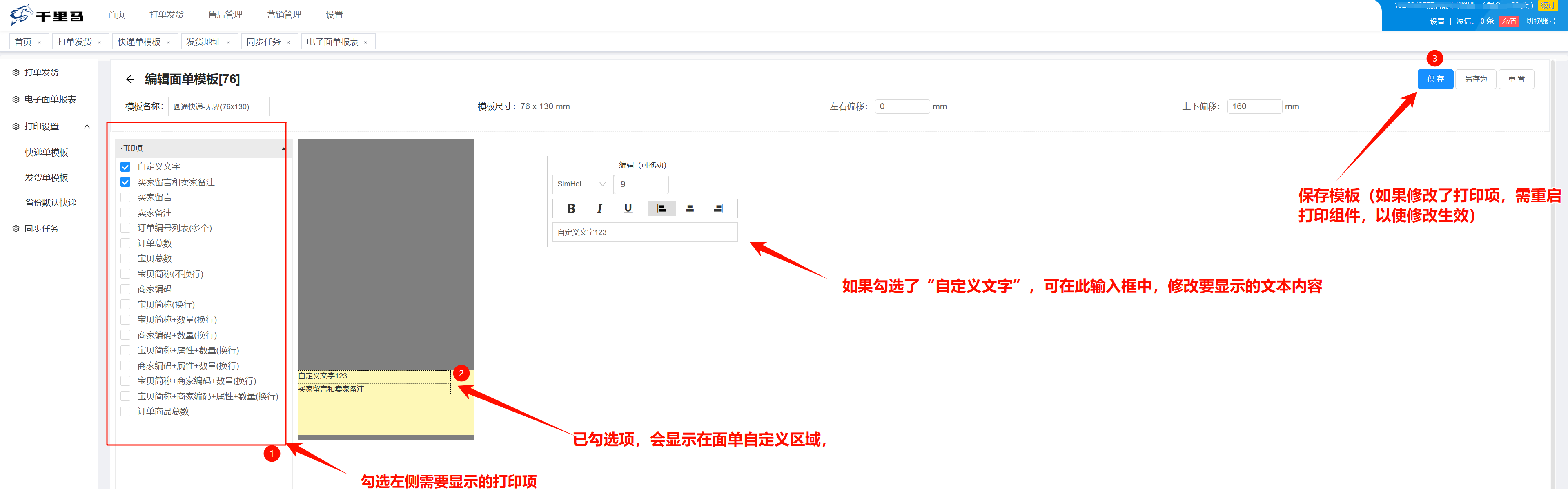 目录 搜索 订购应用与登录系统一、1分钟快速入门二、打单发货管理快递模板管理模板自定义区域设置订单插旗备注电子面单报表管理导入运单号发货创建自由订单订单同步取货/退货地址管理三、设置多店铺管理与授权厂家代发场景设置四、常见问题如果查看我订购的千里马安装电子面单打印组件快递模板自定义区域修改后不生效问题 暂无相关搜索结果! 模板自定义区域设置 选择已创建的模板,点击“编辑”,进入模板编辑界面 编辑页面 面单打印效果如下: 注意:由于打印组件缓存,修改打印项后,需清除缓存并重启打印组件,使修改生效 文档更新时间: 2025-10-30 15:13 作者:hanson