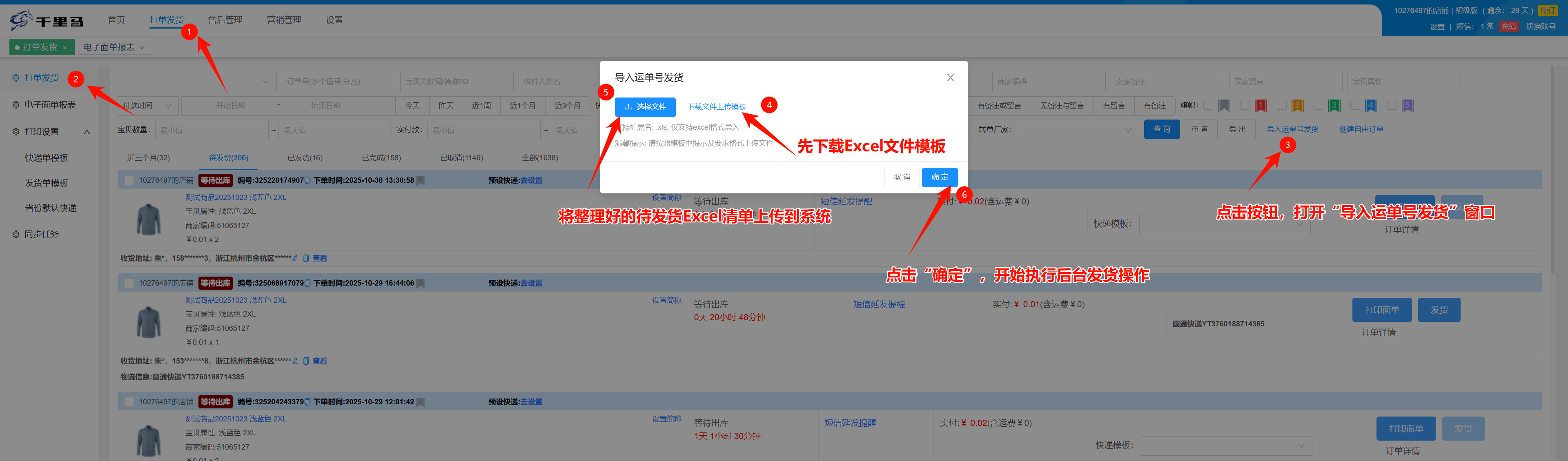 此功能可用于对已获取快递单号的订单进行批量发货操作。操作流程如下:操作完成后,订单状态会自动变更为“已发货” 下载的Excel模板如下图: 上方Excel模板中,共有3个字段信息,均为必填项,订单号与运单号需一一对应,物流编号可切换Excel的Sheet:“千里马京东平台物流公司编码表”,根据单号所属的物流公司名称查找对应的编码文档更新时间: 2025-10-30 14:13 作者:hanson