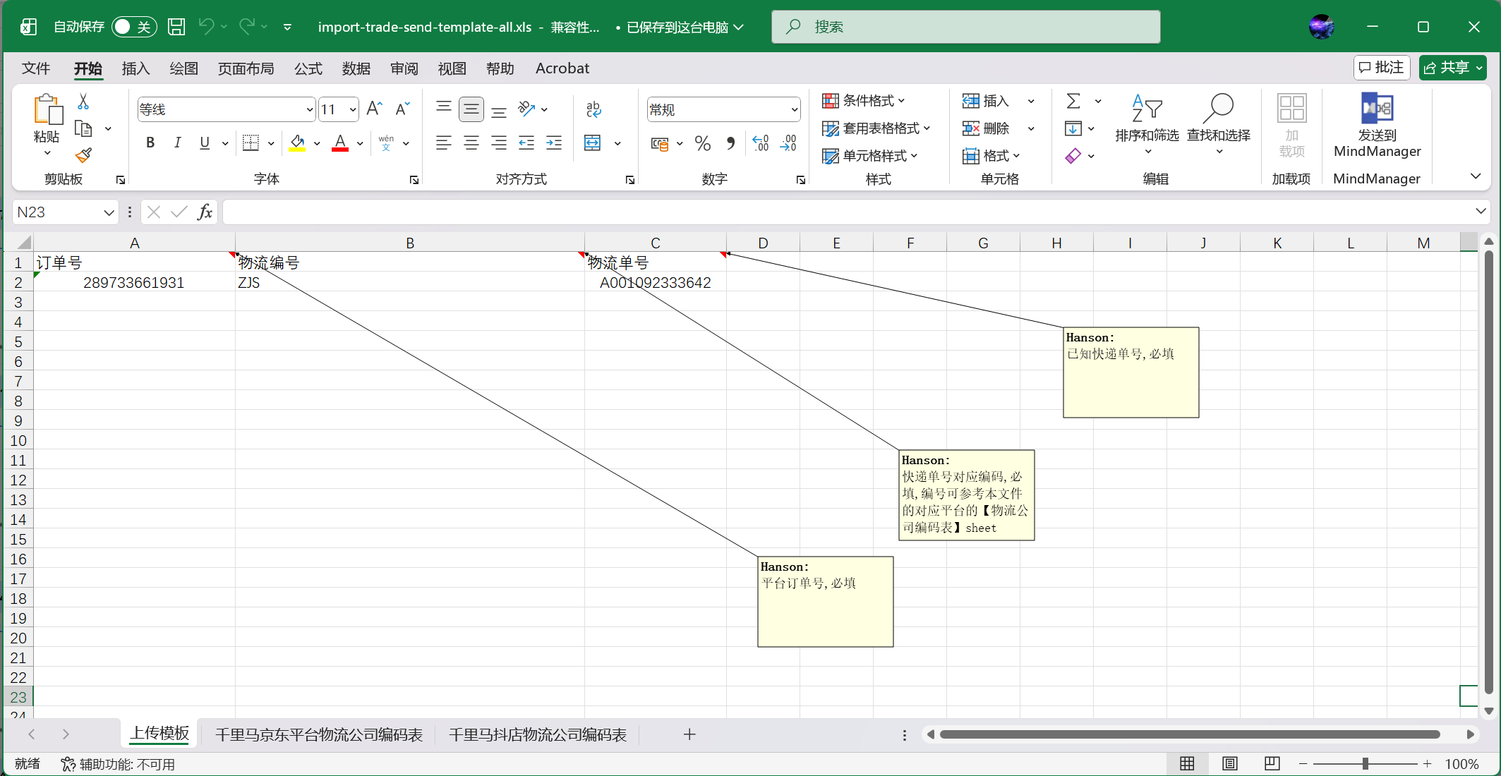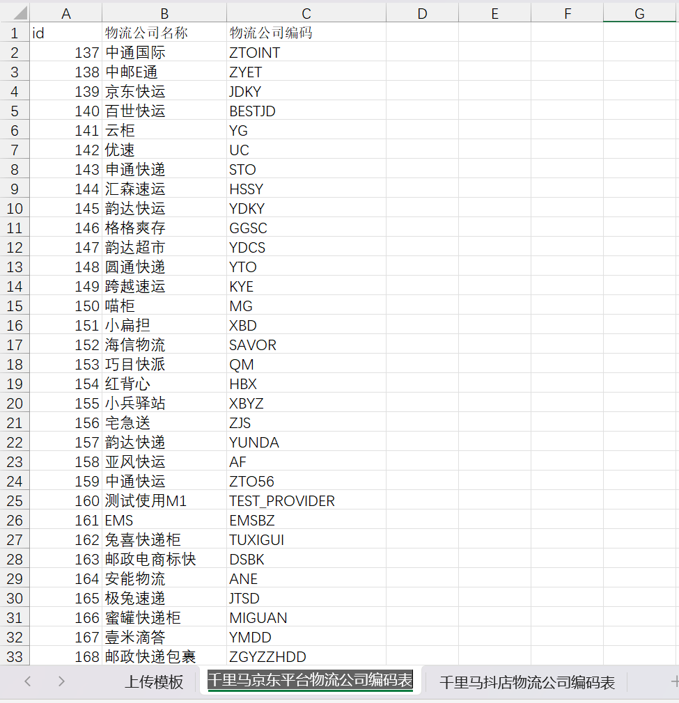 目录 搜索 订购应用与登录系统一、1分钟快速入门二、打单发货管理快递模板管理模板自定义区域设置订单插旗备注电子面单报表管理导入运单号发货创建自由订单订单同步取货/退货地址管理三、设置多店铺管理与授权厂家代发场景设置四、常见问题如果查看我订购的千里马安装电子面单打印组件快递模板自定义区域修改后不生效问题 暂无相关搜索结果! 导入运单号发货 此功能可用于对已获取快递单号的订单进行批量发货操作。操作流程如下:操作完成后,订单状态会自动变更为“已发货” 下载的Excel模板如下图: 上方Excel模板中,共有3个字段信息,均为必填项,订单号与运单号需一一对应,物流编号可切换Excel的Sheet:“千里马京东平台物流公司编码表”,根据单号所属的物流公司名称查找对应的编码文档更新时间: 2025-10-30 14:13 作者:hanson