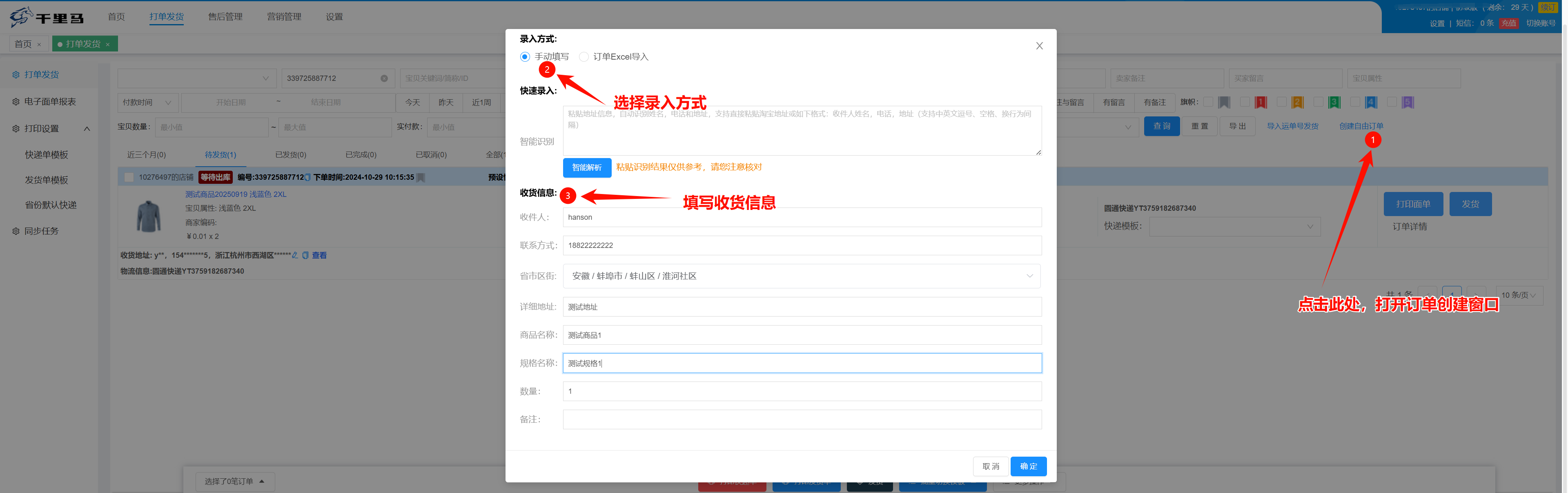 目录 搜索 订购应用与登录系统一、1分钟快速入门二、打单发货管理快递模板管理模板自定义区域设置订单插旗备注电子面单报表管理导入运单号发货创建自由订单订单同步取货/退货地址管理三、设置多店铺管理与授权厂家代发场景设置四、常见问题如果查看我订购的千里马安装电子面单打印组件快递模板自定义区域修改后不生效问题 暂无相关搜索结果! 创建自由订单 商家可创建自由订单,并进行打单发货操作。流程如下: 如有批量创建需要,可通过方式二:订单Excel导入,通过Excel将订单信息批量导入到系统中。文档更新时间: 2025-10-30 14:19 作者:hanson