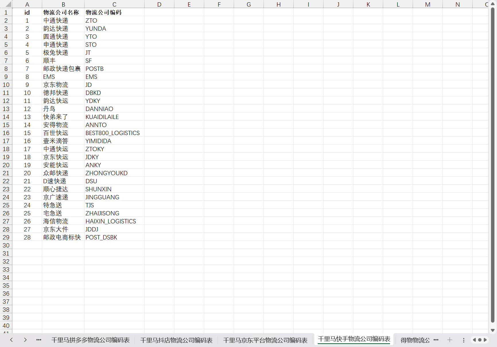目录 搜索 订购应用与登录系统一、1分钟快速入门二、打单发货管理快递模板管理模板自定义区域设置取号打单订单插旗备注电子面单报表管理导入运单号发货订单同步取货/退货地址管理订单批量操作三、厂家代发场景设置与使用四、设置多店铺管理与授权五、常见问题如果查看我订购的千里马安装电子面单打印组件快递模板自定义区域修改后不生效问题 暂无相关搜索结果! 导入运单号发货 此功能可用于对已获取快递单号的订单进行批量发货操作。操作流程如下:操作完成后,订单状态会自动变更为“已发货” 下载的Excel模板如下图: 上方Excel模板中,共有3个字段信息,均为必填项,订单号与运单号需一一对应,物流编号可切换Excel的Sheet:“千里马快手平台物流公司编码表”,根据单号所属的物流公司名称查找对应的编码文档更新时间: 2026-03-25 10:33 作者:hanson