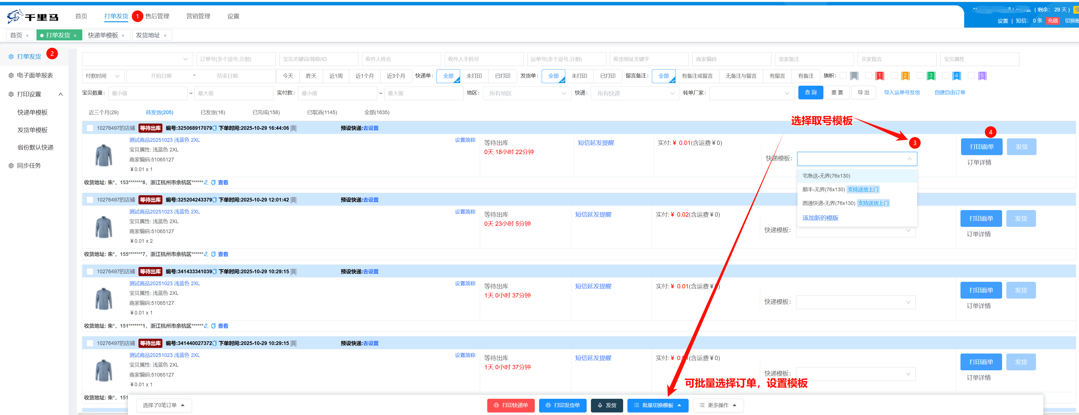目录 搜索 订购应用与登录系统一、1分钟快速入门二、打单发货管理快递模板管理模板自定义区域设置取号打单订单插旗备注电子面单报表管理导入运单号发货订单同步取货/退货地址管理订单批量操作三、厂家代发场景设置与使用四、设置多店铺管理与授权五、常见问题如果查看我订购的千里马安装电子面单打印组件快递模板自定义区域修改后不生效问题 暂无相关搜索结果! 取号打单 设置模板后,即可对订单进行打单操作,如下图 文档更新时间: 2026-03-25 10:34 作者:hanson